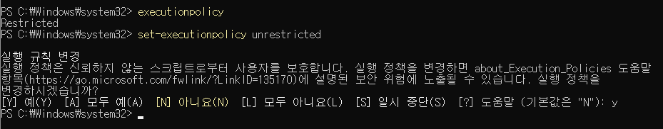 스크립트 실행 정책 문제인 것 같아서 powershell 을 관리자 권한으로 열었다.